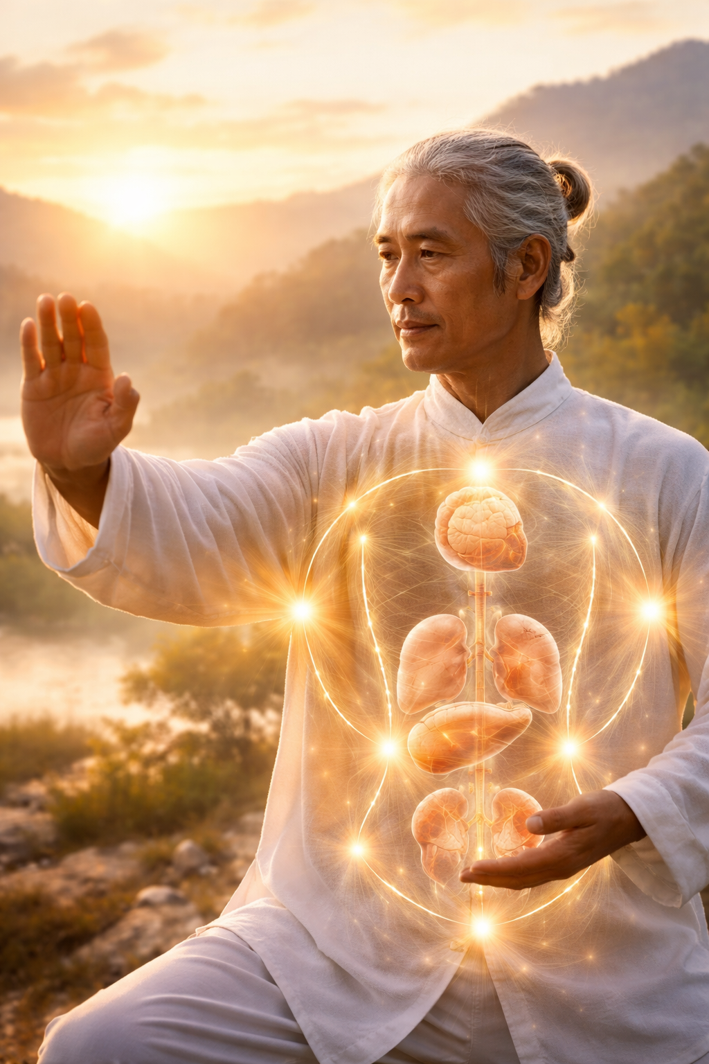 Estos descubrimientos científicos dialogan de manera interesante con principios que las artes internas chinas, como el Tai Chi, han sostenido durante siglos: el cuerpo funciona como un todo integrado en el que cada parte influye en las demás. Aunque la tradición describe este equilibrio en términos de circulación del qi y armonía entre los órganos, la ciencia moderna empieza a comprender cómo el movimiento consciente, la respiración profunda y la regulación del sistema nervioso pueden favorecer esa comunicación interna. Diversos estudios han demostrado que la práctica regular de Tai Chi mejora la coordinación entre sistemas corporales, reduce la inflamación, fortalece el sistema inmunológico, equilibra el estrés y contribuye a un envejecimiento saludable.
