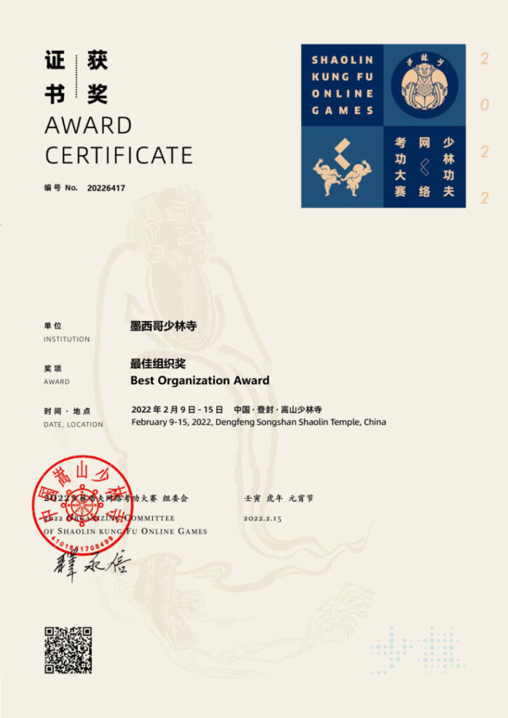 Por éste motivo el día de ayer el Templo Shaolin de China emitió un reconocimiento especial para el equipo mexicano como “Best Organization Award” emitido únicamente para aquellas representaciones donde los atletas mostraron mejor desempeño y determinación.